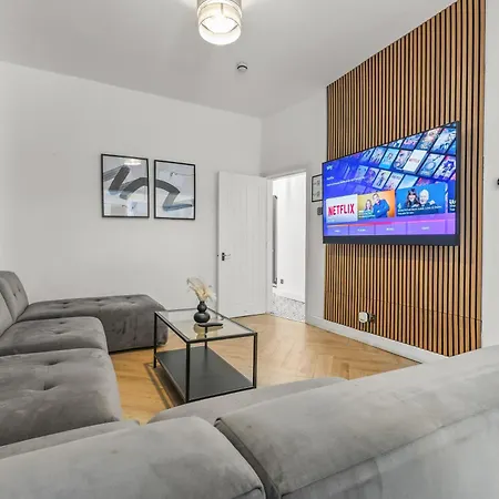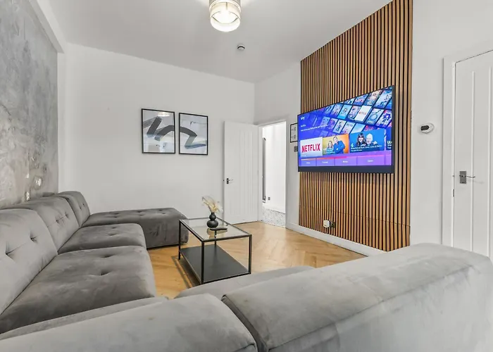 Modern City Centre Townhouse Sleeps 10 & Parking comes with a sofa set and a work desk, as well as a television with satellite channels. Ironing facilities are provided for a comfortable stay. Bathroom facilities also include a separate toilet, a bath, and a shower. There are hairdryers and bath sheets for guests' comfort.